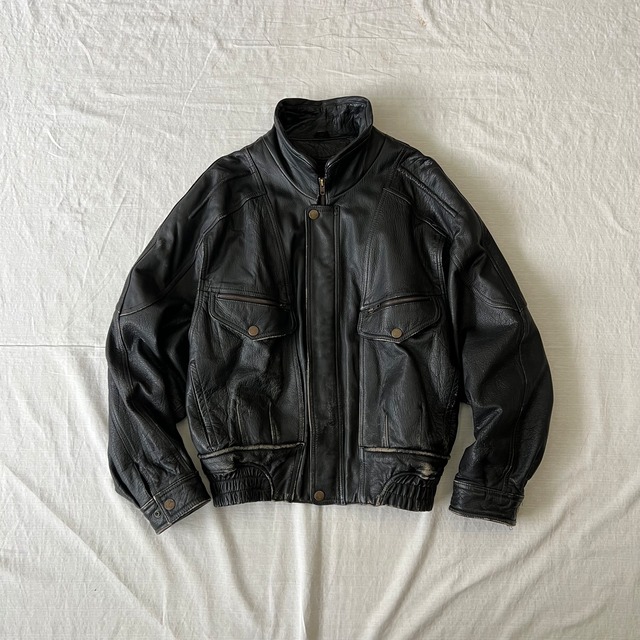 (商品説明) 80年代のレザージャケットになります。 レザージャケットに定評のあるウィルソンズレザーが関わっており、重厚感のあるレザーが特徴です。 フライトジャケットをベースとしたデザインですがハイネックになる仕様や肩周りのパイピングなどファッションとして取り入れやすいデザインとなっております。 (サイズ) 表記サイズ:メンズM 実寸値(※必ず実寸値を参考にしてください。) 身幅:62cm(脇下から) 着丈:65cm(後ろ襟付け根から) 裄丈:91cm *採寸は平置きにて計測しております。 *手作業になりますので若干の誤差はご了承下さい。 (カラー):ブラック (素材):レザー100% (生産国):インド (商品状態):USED品。裾や袖など全体的に擦れが見られますが雰囲気として捉えていただけるかと思います。 *何か気になることがございましたらご対応致しますのでお気軽にお問い合わせよりお申し付けください。(例:着画像が欲しい(男性で/女性で/何cmくらいの身長の人でなどなど)) *当店の商品はアメリカ/ヨーロッパから仕入れたUSEDアイテムが中心となります。 *なるべく実物に近いお色で撮影しておりますが、お客様のお使いのモニターの違いにより画面上と実物では多少色具合が異なって見える場合もございますので予めご了承ください。 (基本的には着画像よりも平置き画像が近いお色が多いです。) *クリーニングによる縮みやパンツ類は裾直しがされている場合がございますので,必ず実寸値をご確認ください。 *極力汚れ等はご覧いただけるようにしておりますがものによっては写真には映らない汚れ等がある場合もございますので何か気になる事がございましたら必ずご購入前にお問い合わせください。 *以上ご理解の上、ご購入いただけると幸いです。 fuzz city ファズシティ アメリカ古着 ビンテージ ヴィンテージ vintage レトロ retro
