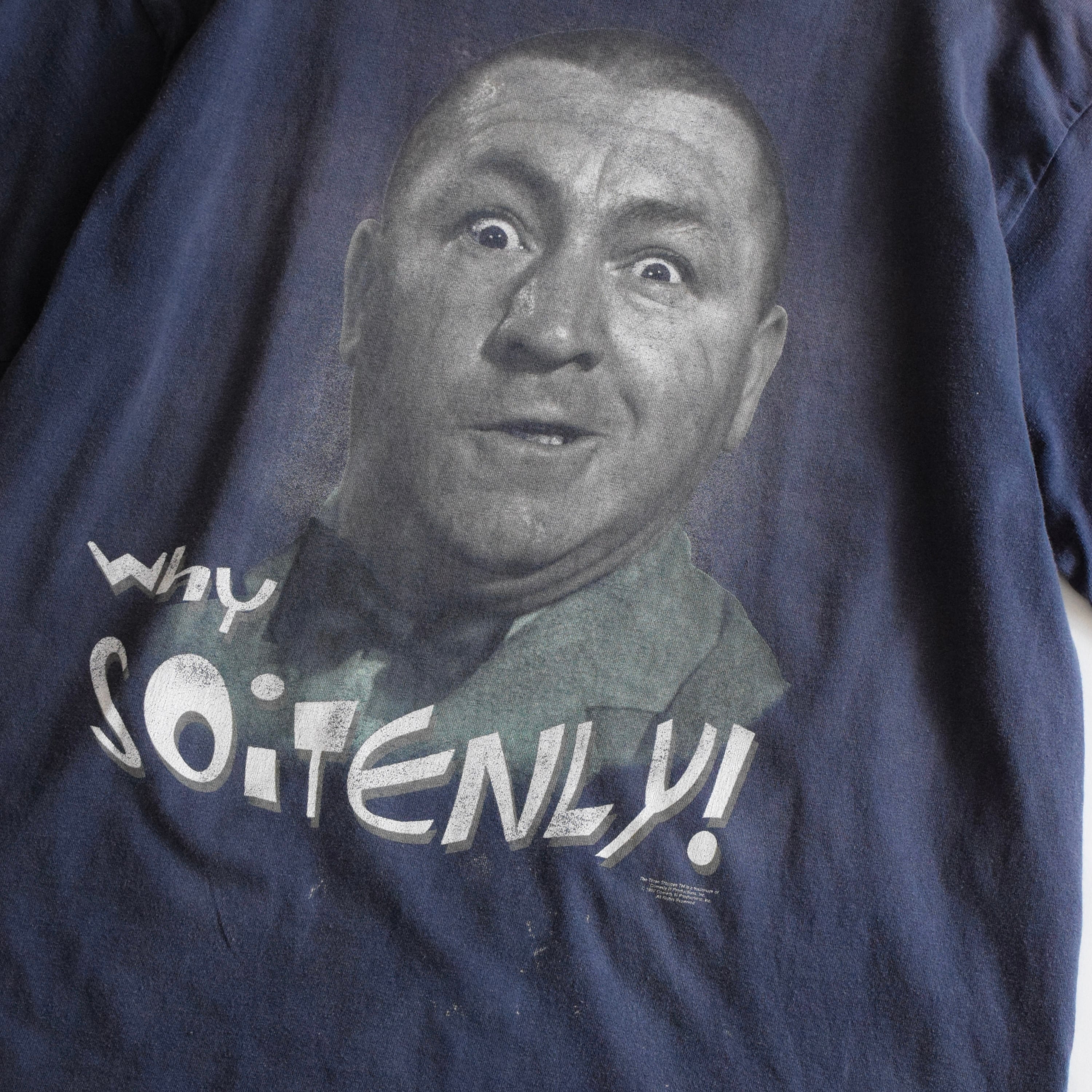 90’s “三ばか大将“ プリントTシャツ メンズXL ネイビー Three Stooges カーリーハワード コメディアン フェイス 古着 ヴィンテージ ft-209【25SST】