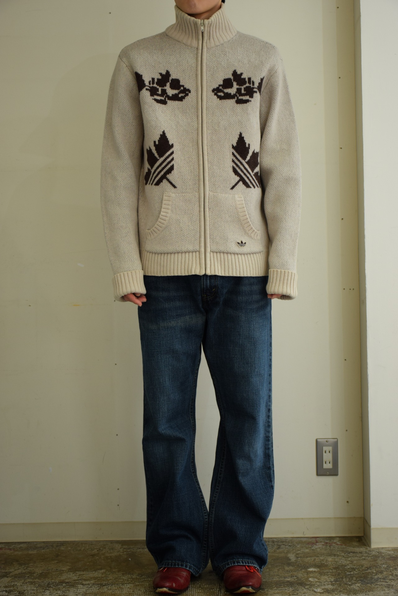 一見柄や生地を見るとカウチンニットの様に見えますが、形はadidasらしいジャージの作りになっていて面白い1着です。