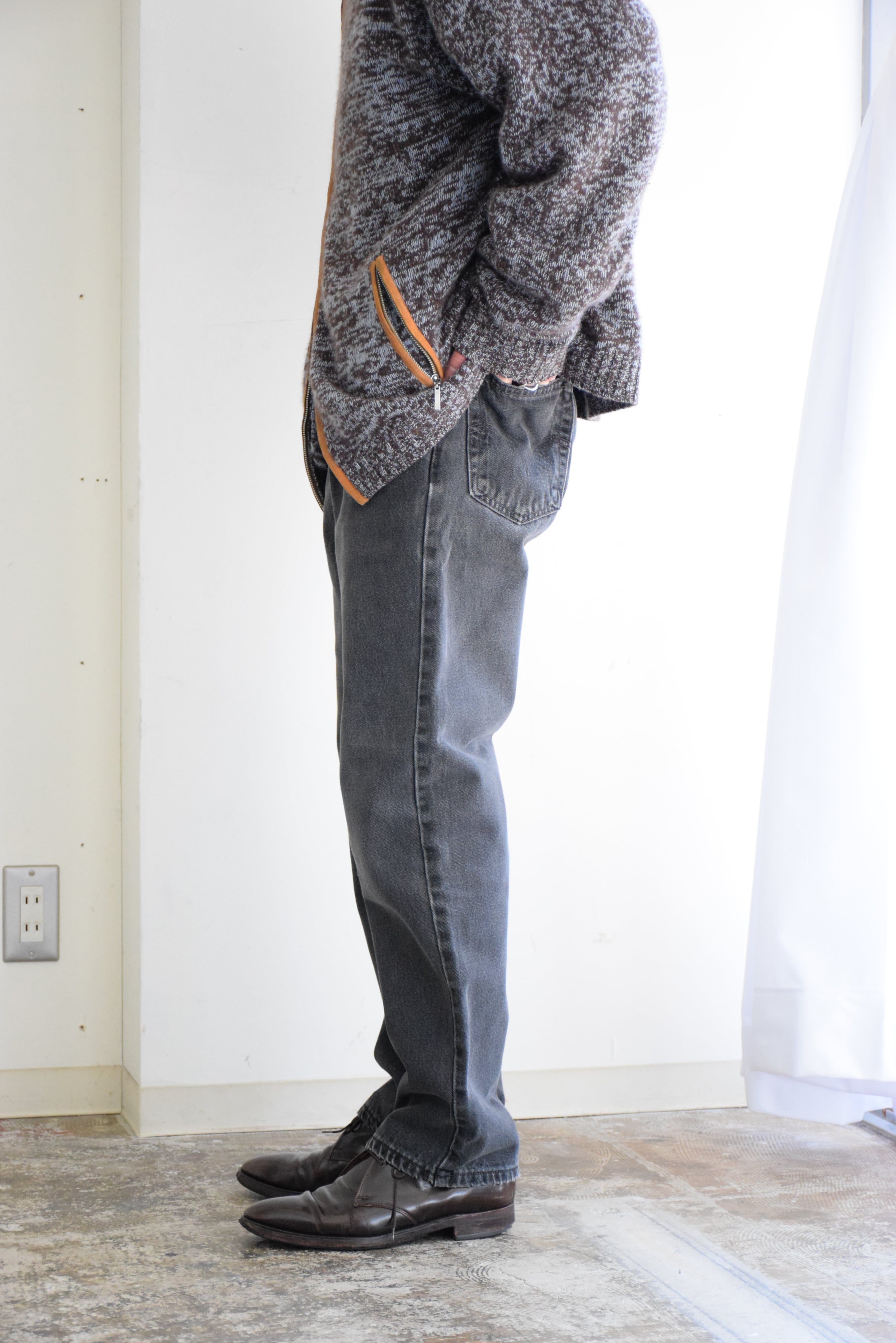 (商品状態):USED品。デニムらしいエイジングやアタリが見られます。両膝にタタキで直した跡がございます。