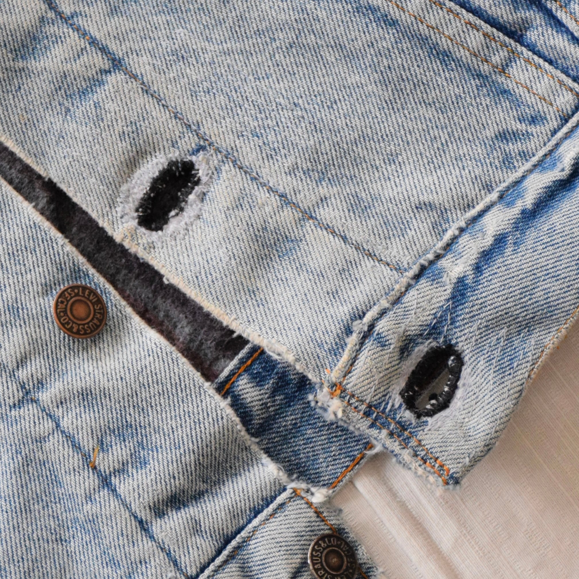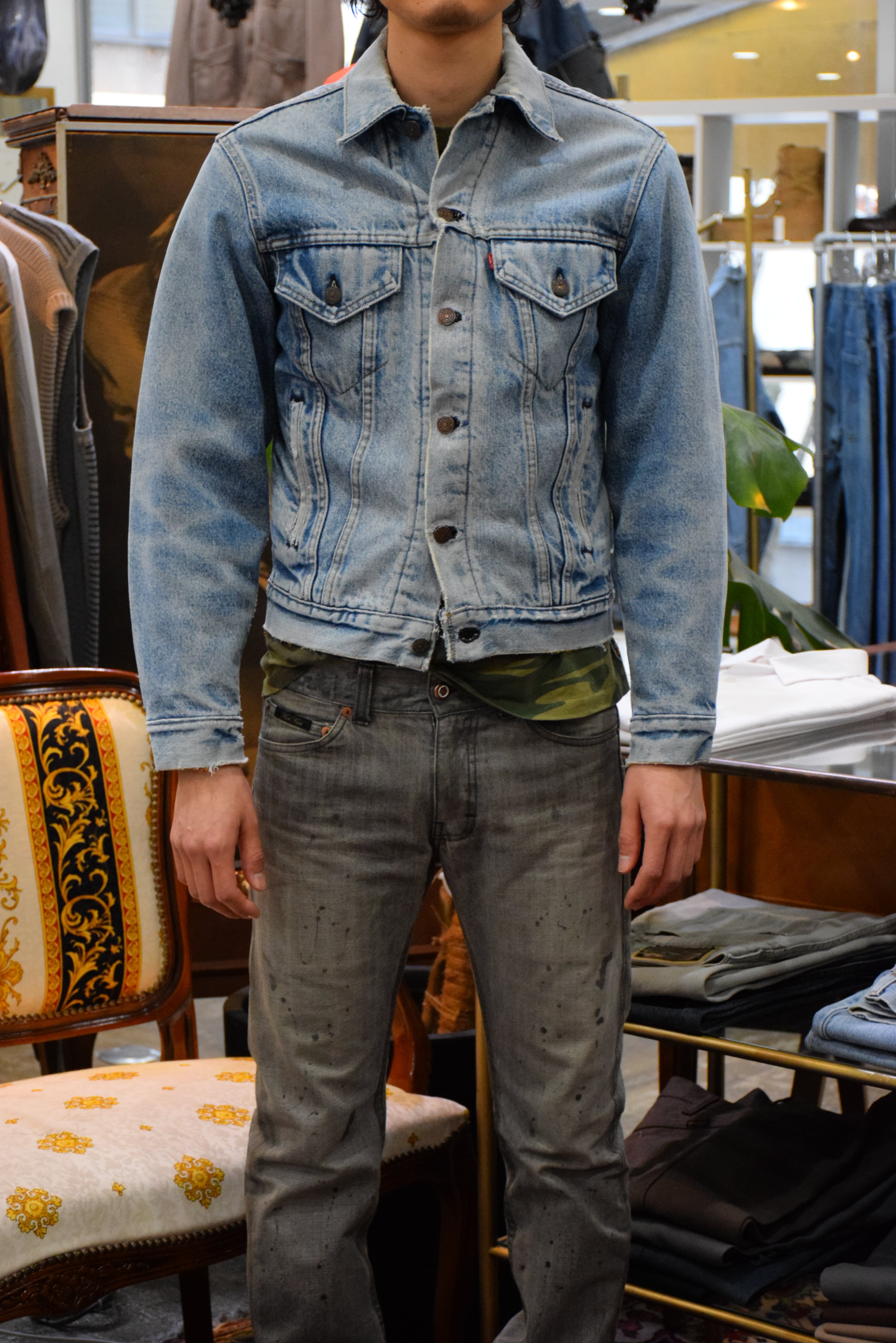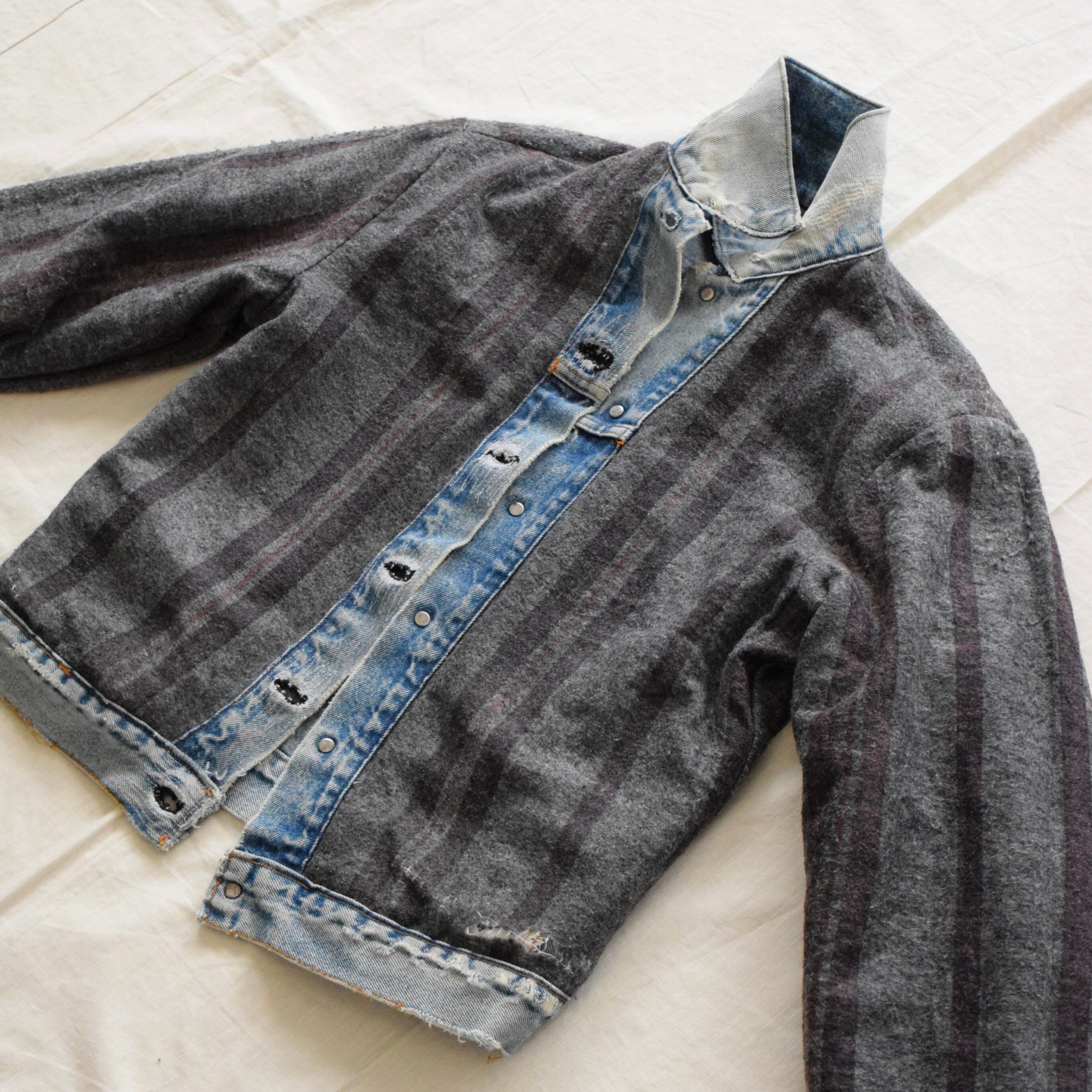 (商品状態):USED品。襟元、ボタンホールにリペアがございます。また裾や袖口等にダメージが見られます。