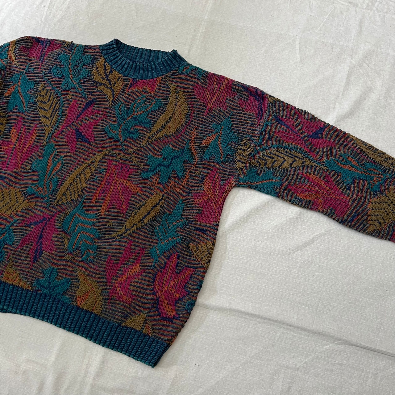 USA製 90’s コットンニットセーター 3Dニット 葉っぱ柄 デザインニット ハイネック 古着 fc-1092