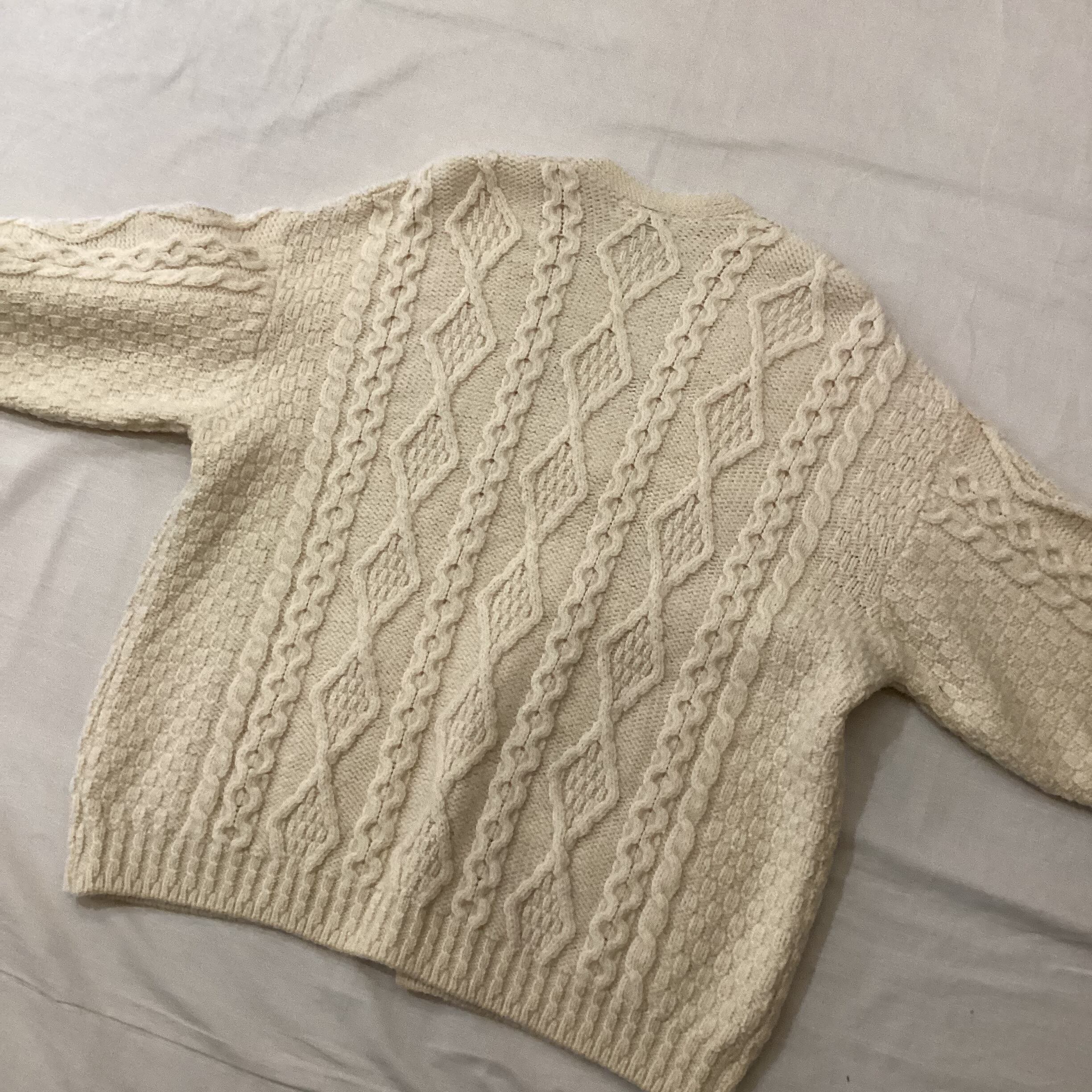 ケーブル編み+暖かく重厚感のあるウールニットが可愛らしいです。