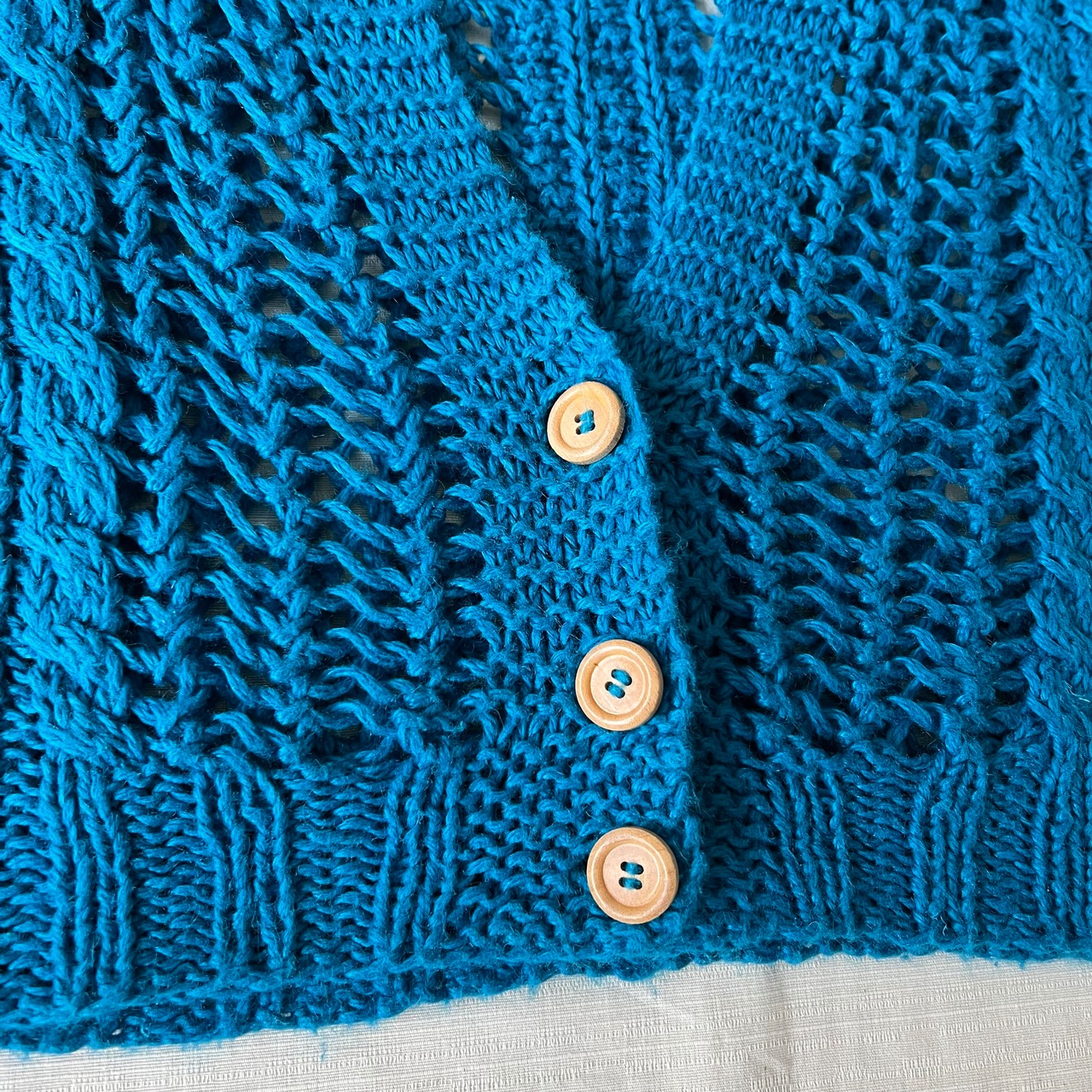 ハンドメイドらしいざっくりとした編み方が特徴で透け感もあり上品さがありつつも温かみもあります。