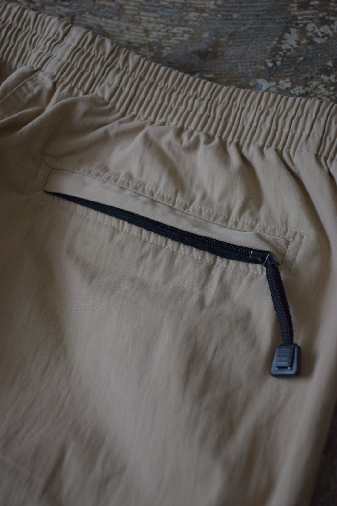ウエストのゴム+ドローコードやサイドのジップポケット、ギア感もありつつ生地やカラーでバランスを取っている印象。