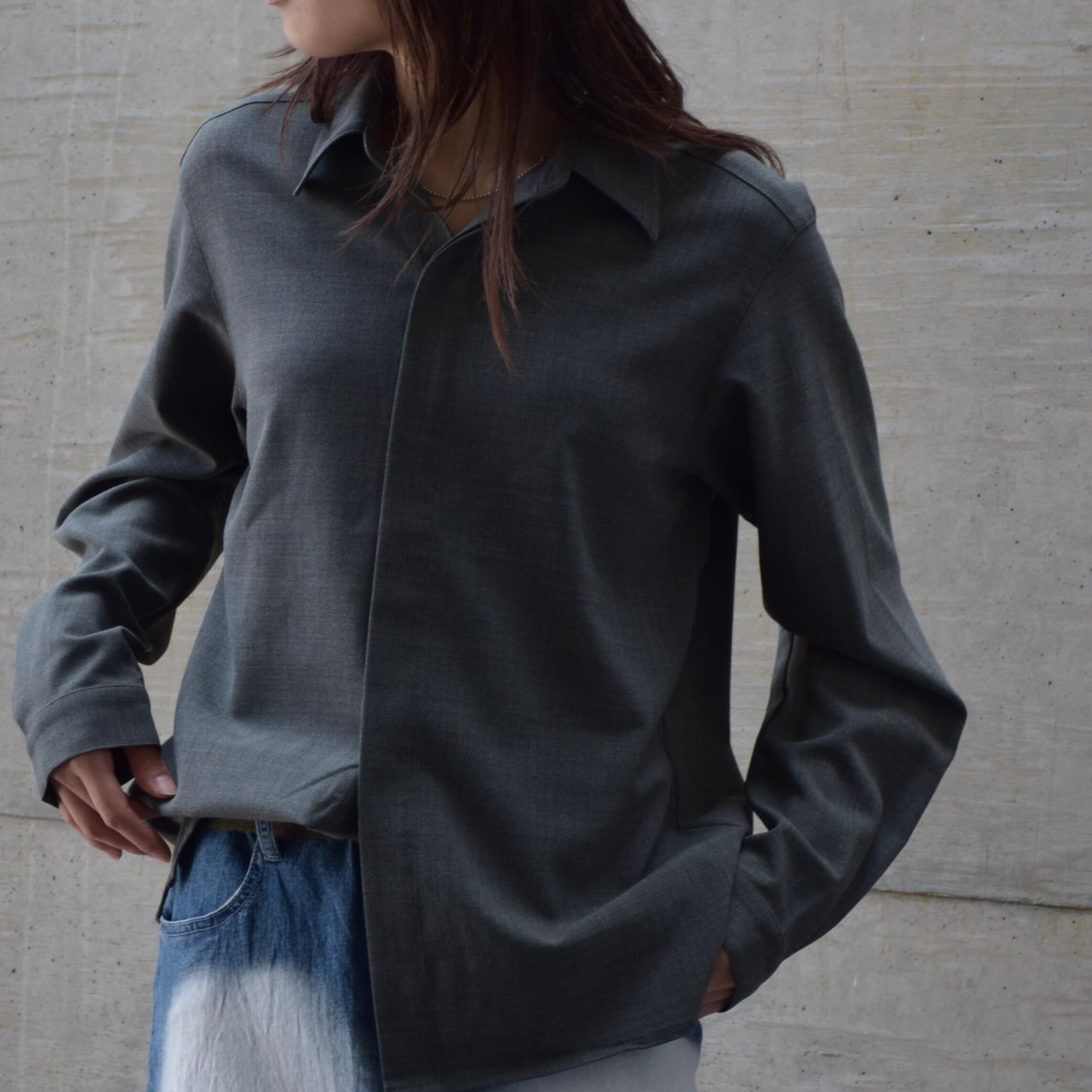 カラーもチャコールグレーで落ち着いた印象のシャツになっているので一枚羽織るだけでも上品で大人な雰囲気になるのでオススメです。